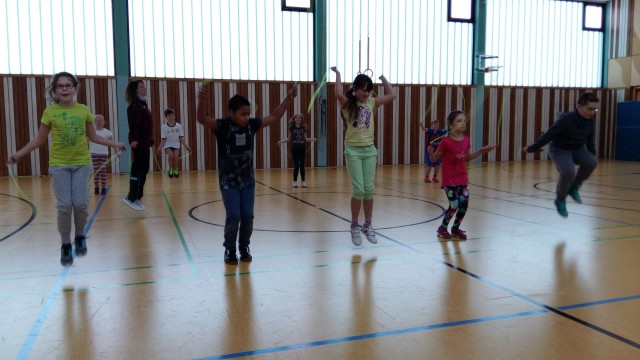 „Skipping Hearts“ ist eine Aktion der deutschen Herzstiftung und möchte Kinder bewegen, sich sportlich zu betätigen. Dabei bietet das Programm ihnen ein Training im Bereich Rope Skipping (Springseil) an. Unsere Schülerinnen und Schüler der dritten und vierten Klasse hatten die Möglichkeit, an einem solchen Programm teilzunehmen, wobei ihnen eine gute sportmotorische Basis vermittelt wurde. Während der zwei Stunden Trainingszeit konnten sie verschiedene Sprünge in den Kategorien Einzel-, Partner- und Gruppensprung üben. Im Team wurden so Schnelligkeit, Ausdauer und Kraft aber auch Koordination, Beweglichkeit und Rhythmusgefühl verbessert. Highlight war natürlich die eingeübte Choreografie, die im Anschluss an das Training, den Eltern und den Kindern der ersten und zweiten Klasse präsentiert wurde.