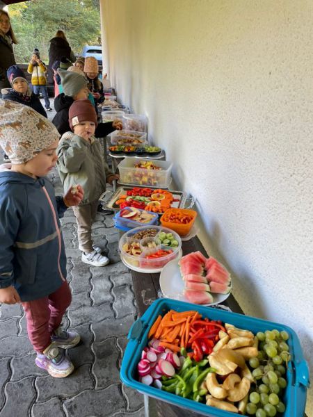 Zielpunkt für alle Gruppen war die Grillhütte. Dort warteten bunt bemalte Bewegungssteine, die zum Nachmachen animierten, und vor allem ein großes, gesundes Buffet. Die Eltern hatten sich dafür richtig ins Zeug gelegt: neben frischem Obst und Gemüse gab es kleine Kunstwerke wie Eulen aus Gurken, Karotten und Trauben, die bei den Kindern besonders gut ankamen.